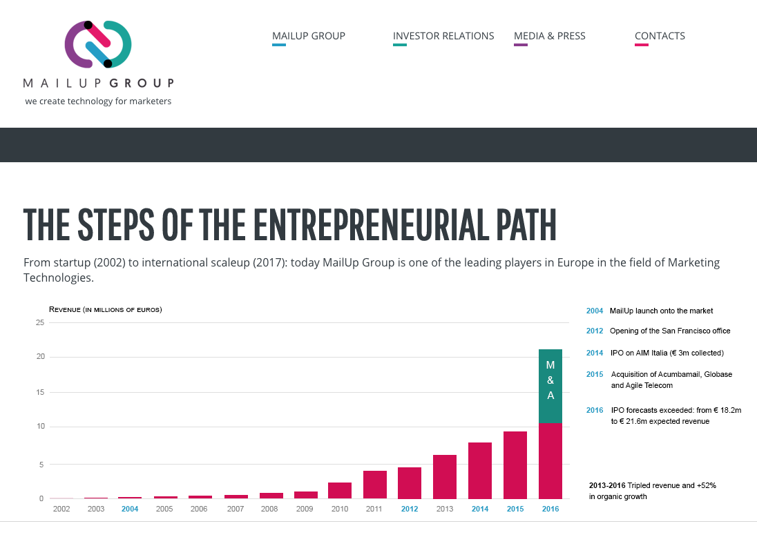 “With mailupgroup.com, we didn’t just want to create a new website – we wanted to convey what it is that made the Group a leading player in Europe in the marketing technology sector, progressing from a turnover of 6.5m euro to 18.9m euro in the space of three years. A journey of growth stretching from 2003 to today that has transformed us into a corporate group with 9 offices worldwide and a brand portfolio offering its solutions in over 50 countries”.