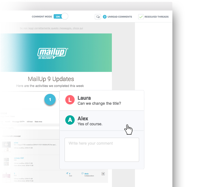 Introduced along with the release of MailUp 9, Collaboration is a unique tool. It is designed to streamline and facilitate feedback processes and the approval of email messages – a process that is often long and complex, since it requires the contribution of various people or teams.