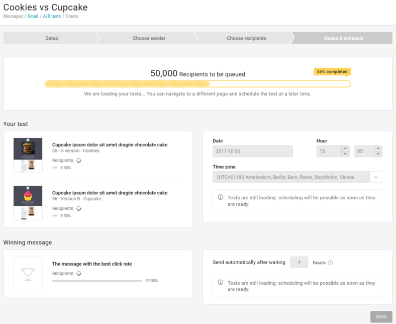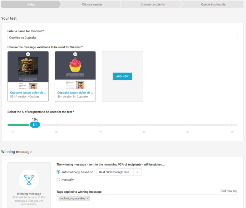 Once loading is complete, you get a nice, full preview of how the A/B test has been set up. If the winner is decided automatically, it will be scheduled here.