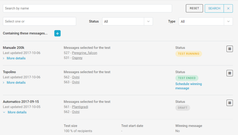 Any action to edit or alter an A/B test is managed from here, where in the past some actions were (wrongly) available from the Send status section. Speaking of Send status, clicking Manage A/B test from a message involved in an A/B test now redirects to the Details page for that test.