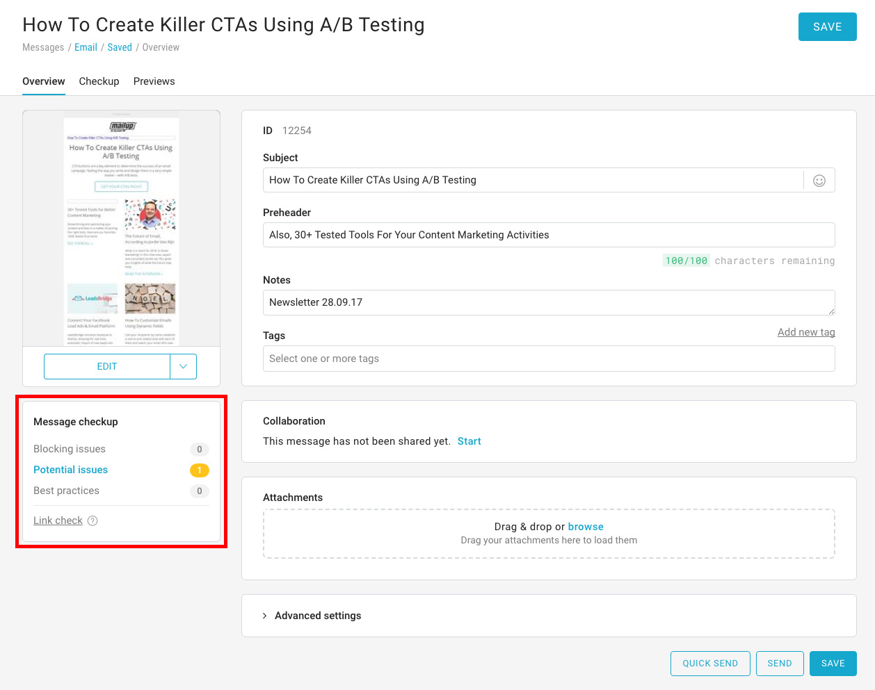 In the Overview page for a message, a new Message Checkup box pops up right under the message thumbnail. In case of issues, the relative severity is highlighted, and a click redirects to the Checkup page for more details.