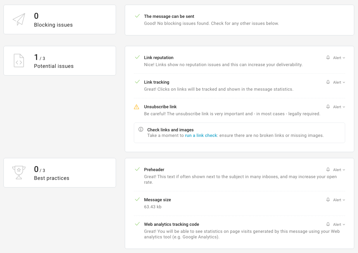 One of the main jobs that a professional Email Marketing platform needs to perform is to help you answer a simple, but key question: is the message ready to go? That includes ensuring that you avoid issues that may negatively affect deliverability, and recommending best practices that can help increase the campaign’s performance.