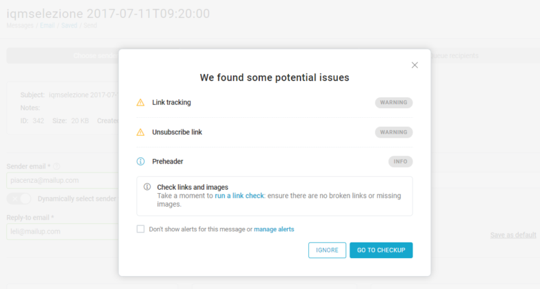 In case the message presents some issues, a modal window pops up when saving or sending that message. These alerts are user-defined, so they can be turned off (for a specific message or for any message).