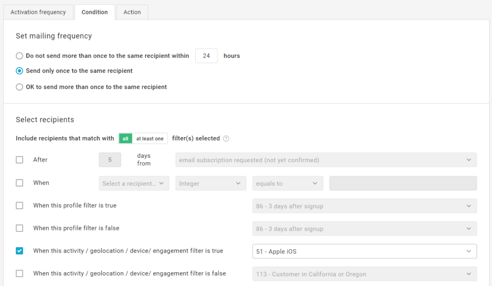 Follow the route: Automation > Automatic submissions. Select the automatic campaign and set, in the tab Conditions, the flag on the condition When is the type filter true: device. Select Apple IOS and in the Actions tab move the recipients to the group dedicated to Apple users you created.