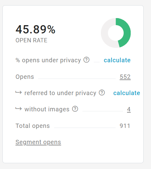 On the main statistics screen, you will see under the rate of unique openings, the entry Openings under privacy. By clicking on Calculate, you will be able to see both the percentage and the actual number of who received the message on Apple Mail (both on desktop and on mobile).