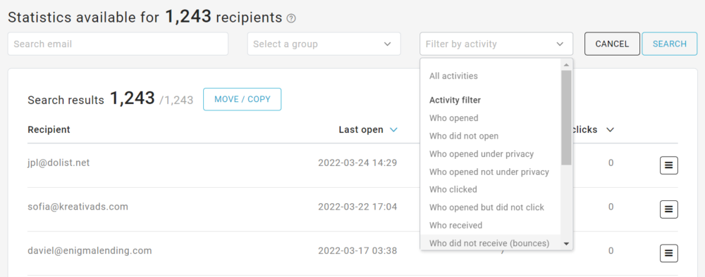 By going to the Recipients tab, you can choose the recipients who received the message on Apple Mail as the activity filter, and get even more contact details, such as the email address and time of receipt of the message, as shown in the image: