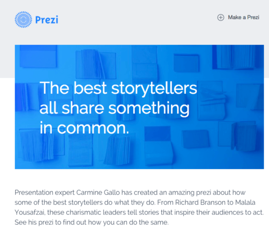 Here’s an example from Prezi (via Really Good Emails). The subject line is “Learn the storyteller’s secret”, and the headline and first paragraph support that: