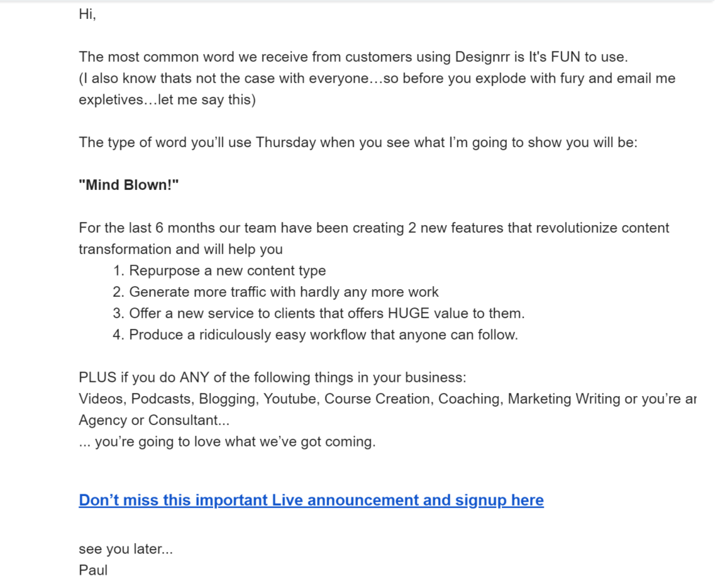 For B2B email newsletters, Find a Way Media found a link between length, design and effectiveness, with the longest emails tending to have the worst design and the worst results.Their research showed that the average length of B2B email newsletters was 273 words, and the best performers were even shorter with an average of 241 words.The bottom line: keep them short. This example from Designrr is just over 150 words long: