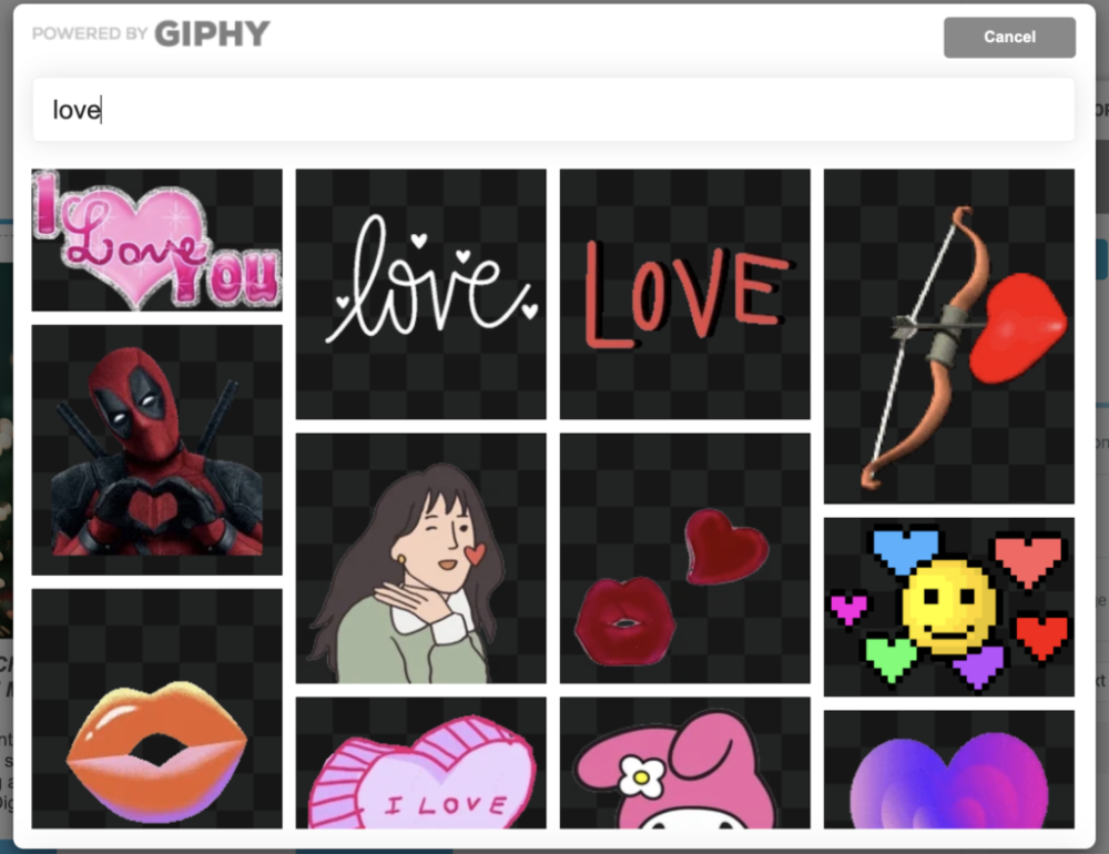 Click on “Add gif” or “Add sticker” and search the vast gallery for available GIFs and stickers that are ideal for the message content and your creative needs.