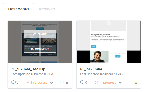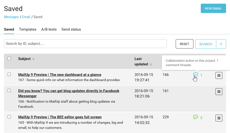 Once collaboration has started on a certain message, the project status is shown on many pages within the MailUp platform. For example, an icon is shown on the page that lists email messages.
