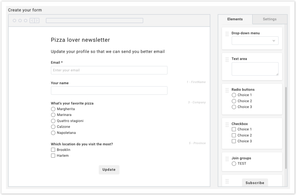 With MailUp you can create custom profiling forms using the drag & drop editor.