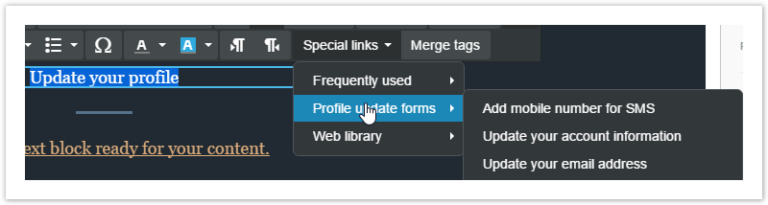 You can also link your profiling form to a portion of the text of the message. Just highlight the text and select, in the advanced toolbar, Special links > Profile update forms.