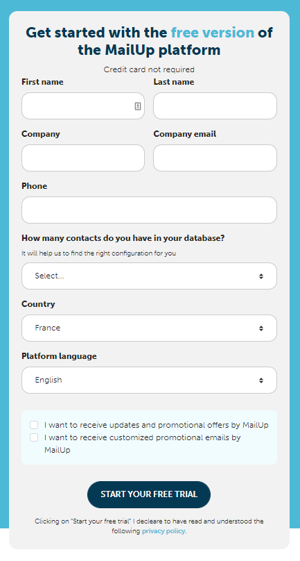 - always enter the fields to request active and explicit consent in your registration and profiling forms and the link to the Privacy Policy, as we also do at MailUp in the activation form of the Platform Free Trial: