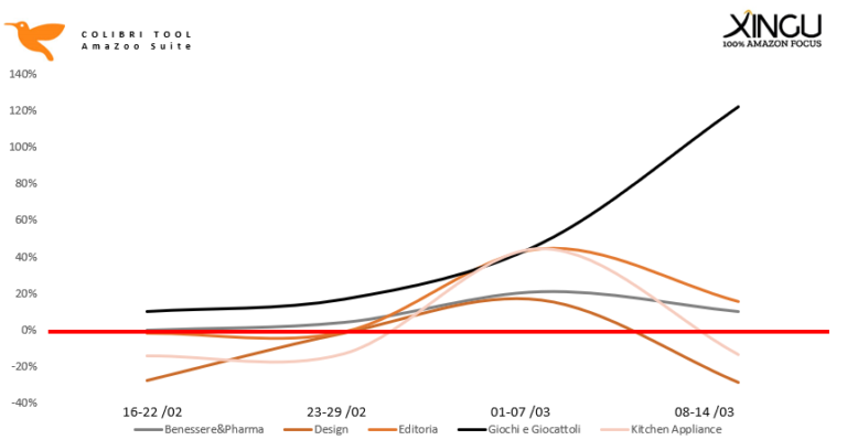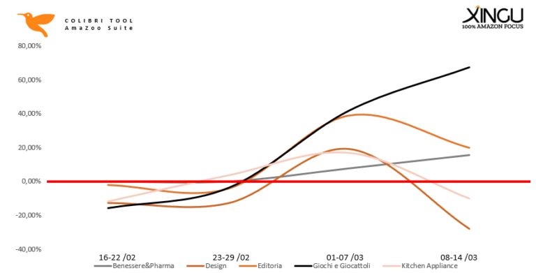 The peak of the week 1-7 March is evident for almost all sectors, with the exception of Games and Toys, whose rise continues in the following weeks.