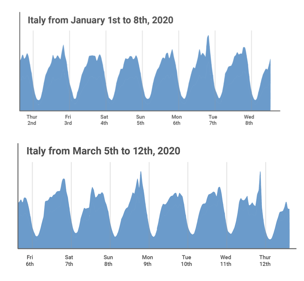Thestudy was conducted (in addition to Seattle and South Korea) on North Italy, giving us a picture inwhich Internet traffic is grown by morethan 30% in the comparison between two periods: 1-8 January 2020 and 5-12March 2020. The increase is recorded at all hours of the day and night.