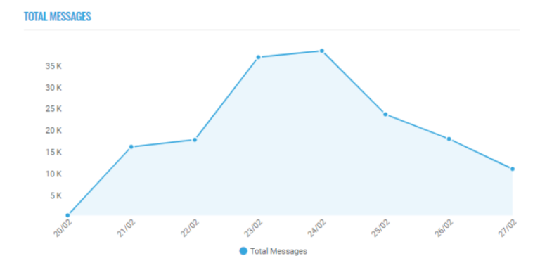 FromFebruary 20 (the day before the news on the first Italian coronavirus casespread) to February 27, there were over 153,000 conversations that met therequirements above and generated almost 5 million interactions. The peak of conversations occurredon the days between Sunday 23 andMonday 24 February, when the measures aimed at limiting the spread of thevirus (closure of schools and meeting places) were disseminated andcommunicated.
