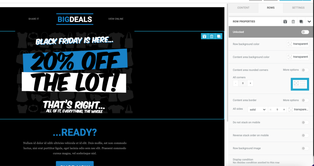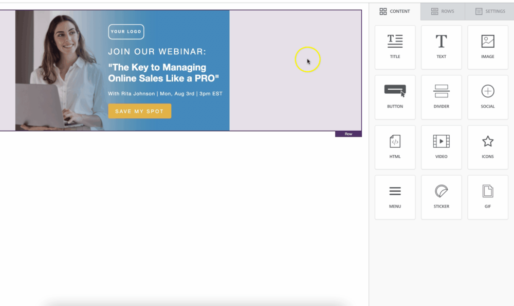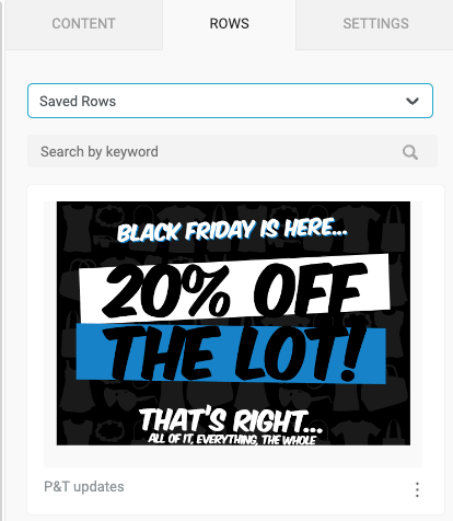 - When creating a new email, click on the “Row“ tab and select your Saved Row: