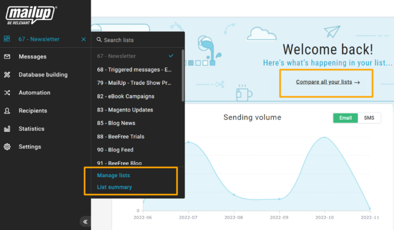 Managing many mailing lists is very easy with the dashboard you find on the left when you log into MailUp:
