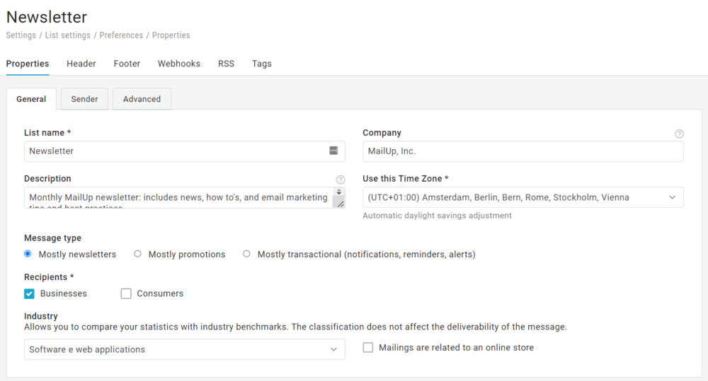 List: an independent set with its own list of messages, senders, statistics, automatic mailings, lists of recipients (suspended, subscribed, unsubscribed) and groups. The adjective independent means that a list’s message, statistics, groups, and subscriptions are not visible and cannot be used in other lists. Thus, a recipient can be subscribed to only one list (e.g., if he or she is a customer, he or she will be subscribed to the “Customers” list and not to the “Prospect” or “Partner” lists) or he or she can be subscribed to more than one list (to the “Newsletter” list and to the “Promotions” list) if, for example, he or she has consented to be subscribed to more than one list during the subscription process.