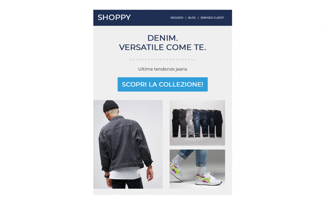 Let’sstart with a practical example: imagine we want to create an email for the newcollection of jeans available on our e-commerce site. We’ll need to show ourmale users the men’s collection,while women will be shown the women’scollection, as in the example below: