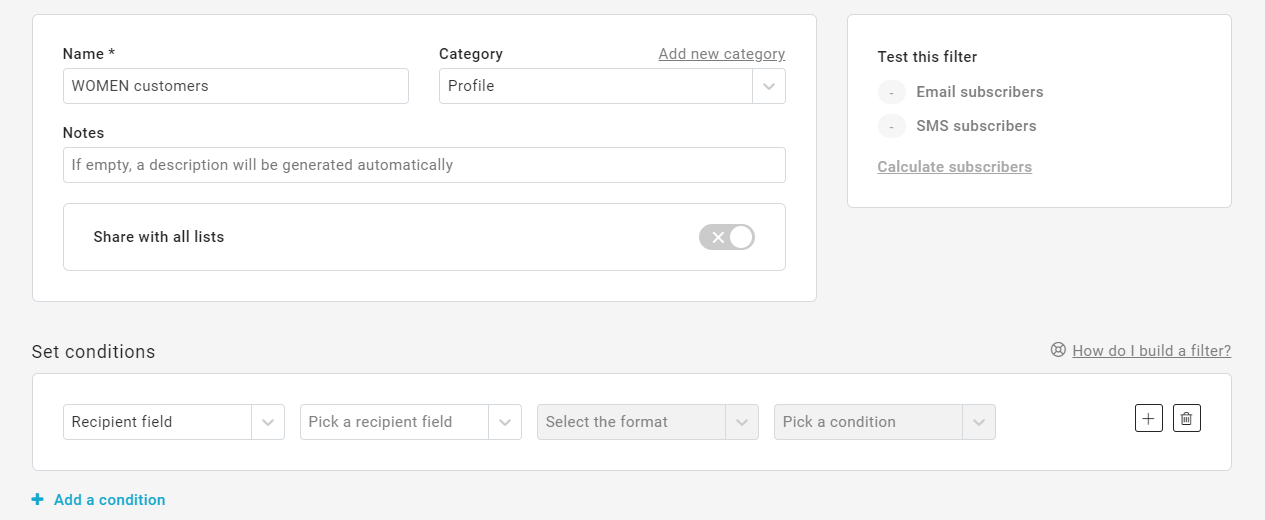 Firstyou need to create the rules toapply to the lines of content. Use Filters to do this (in the section Recipients> Filters) which can regard personal data, type of business,geographic, by device. To use Conditional display we only need to use the Personal data filters.