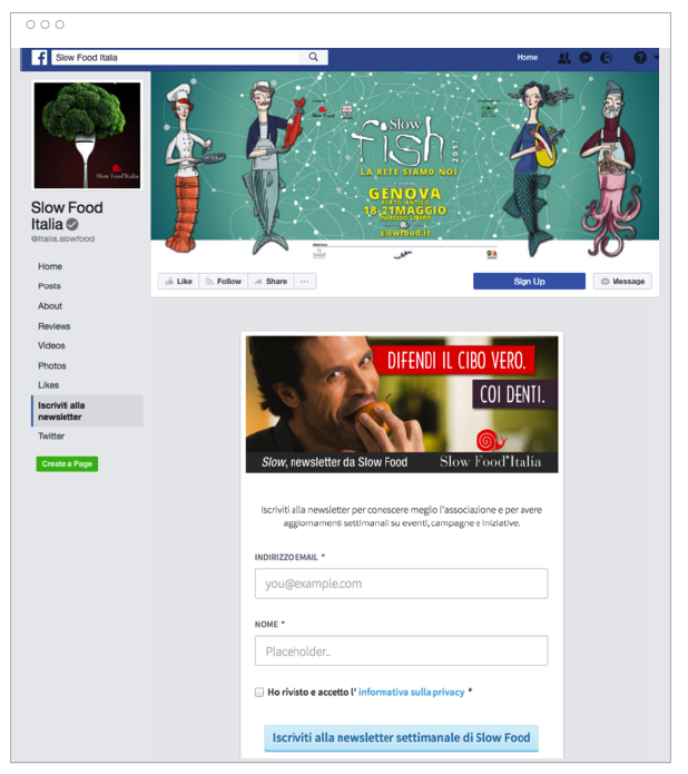 • Facebook page:every day the average user spends 50 minutes on Facebook. Intercepting users on this platform is also decisive: we suggest inserting a newsletter subscription form directly on your company page. To do this, all you need is a simple app like this.