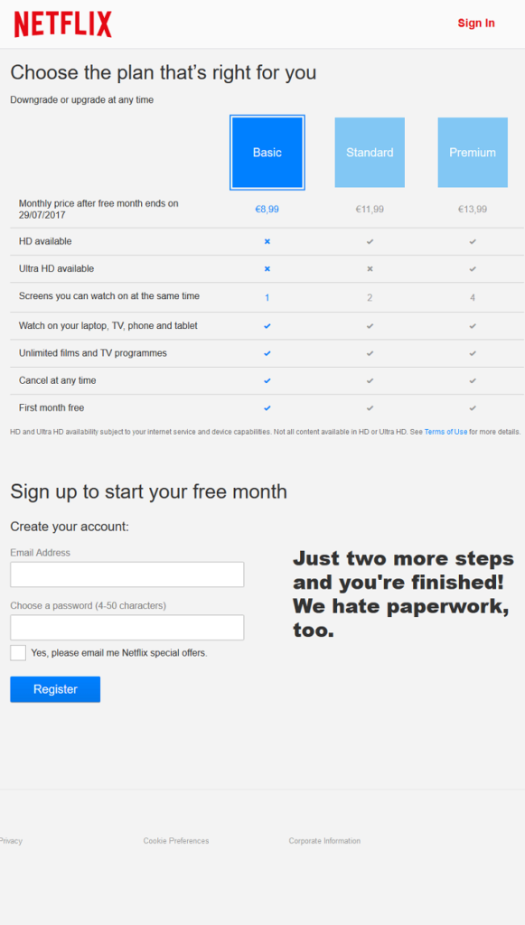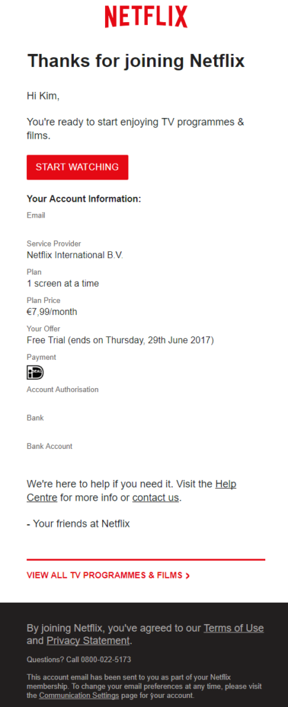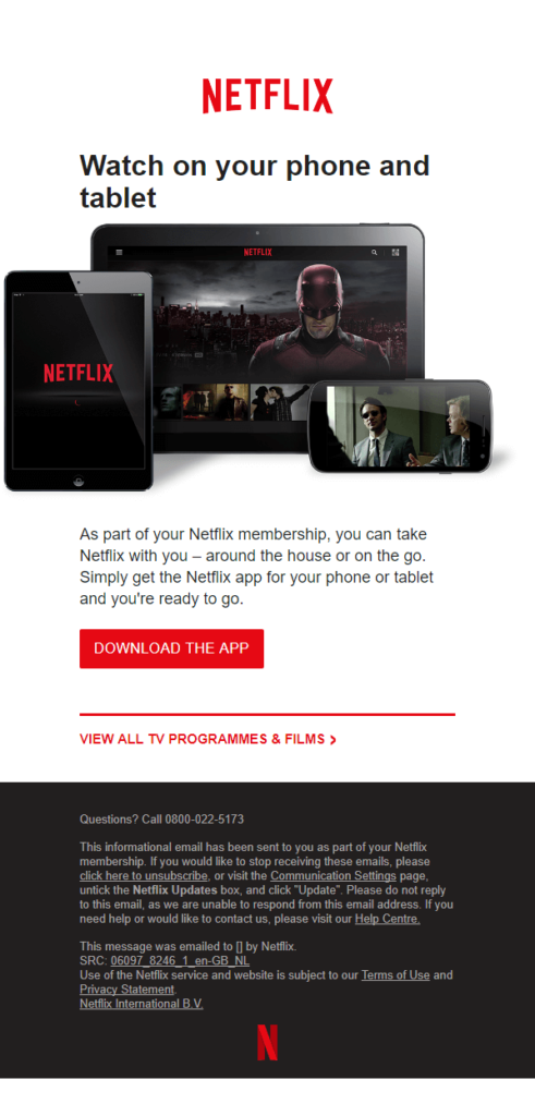 These emails can be alternated with promotional emails that advertise products and services, thereby offering additional good reasons to make the purchase once the trial ends. Here’s how Netflix does it: