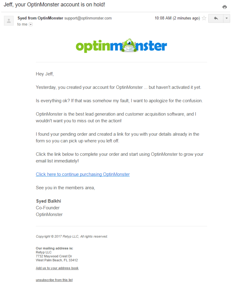 This is that cluster of drip campaigns that sets in motion a series of re-engagement emails, inviting recipients to return to the site, open an email, click, or in the worst case, communicate that the lack of interaction will inevitably result in unsubscription.