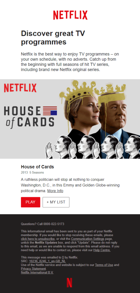 We’ve finally come to the type of drip campaign that is held dear by many marketers. This type of campaign triggers the sending of targeted communications about new offers or products. They create an autonomous and immediate track that is parallel to the updating of your product catalog and all the new items produced. Also in this case, Netflix has an interesting example to note.