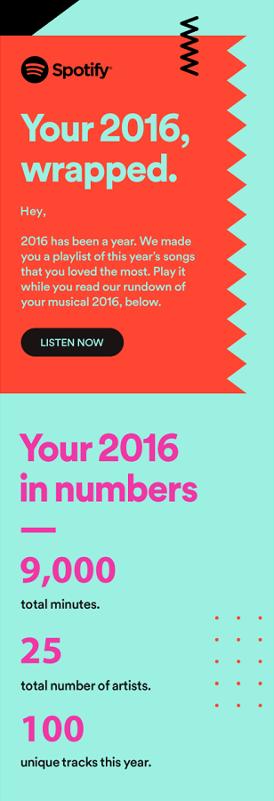 Engagement means both being present and retaining users. There are many ways to engage a user, and every business has its own tools to do so. Spotify does it very well, sending periodic emails which take stock of the user’s listening, tracing out a sort of listener profile.