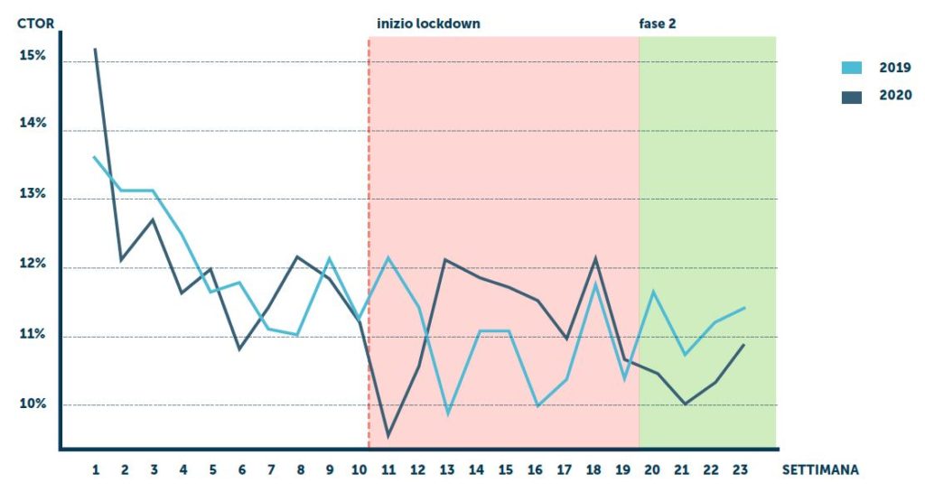 The 2020 CTOR shows a fluctuating yet clear overall drop from 14.90% in week 1 to 9.80% in week 11—which was the start of the national lockdown (-34.23% ).