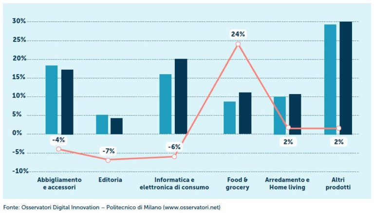 It’s worth mentioning that the food and grocery sector went from 1.6 billion euros last year to 2.5 billion this year (+56%). This leap, which was definitely from the March–April (lockdown phase) restrictions, prompted many consumers to buy essentials online. On the other hand, many supermarkets adapted their own sales and distribution processes.