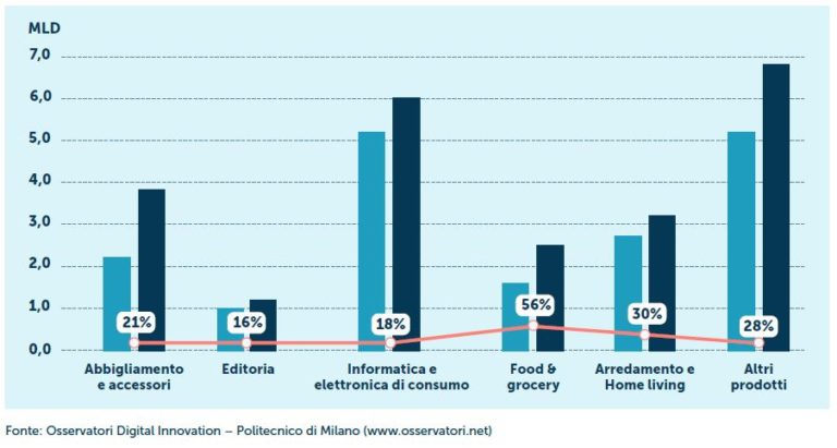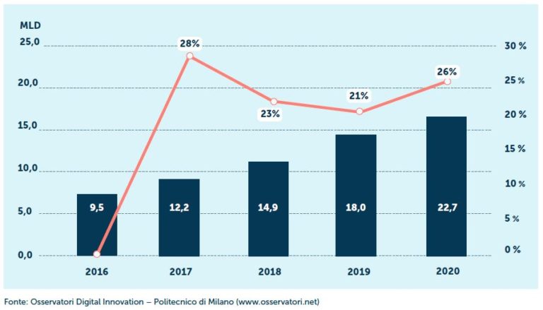 The analysis starts from the previous years’ sector growth in terms of product purchases in billions of euros. The total value expected by the end of 2020 is 22.7 billion euros with a relative + 26% increase since the previous year.
