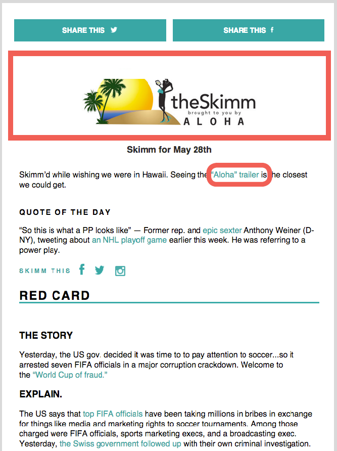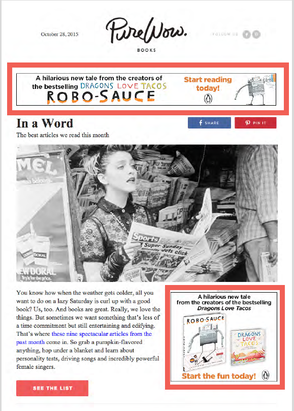 This downward trend does not mean that banners have stopped being one of the most commons forms of advertising, including in emails. Here is how PureWow uses them in both the opening and the body of the message.