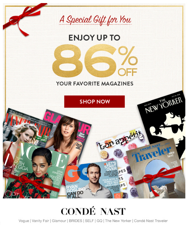 For publishers and for all those who make a living from content, however, the considerable (human and financial) investment required for email marketing does not have such an immediate return. In the best cases, there are periodic communications used to push people to take out subscriptions, such as the following example from Condé Nast.