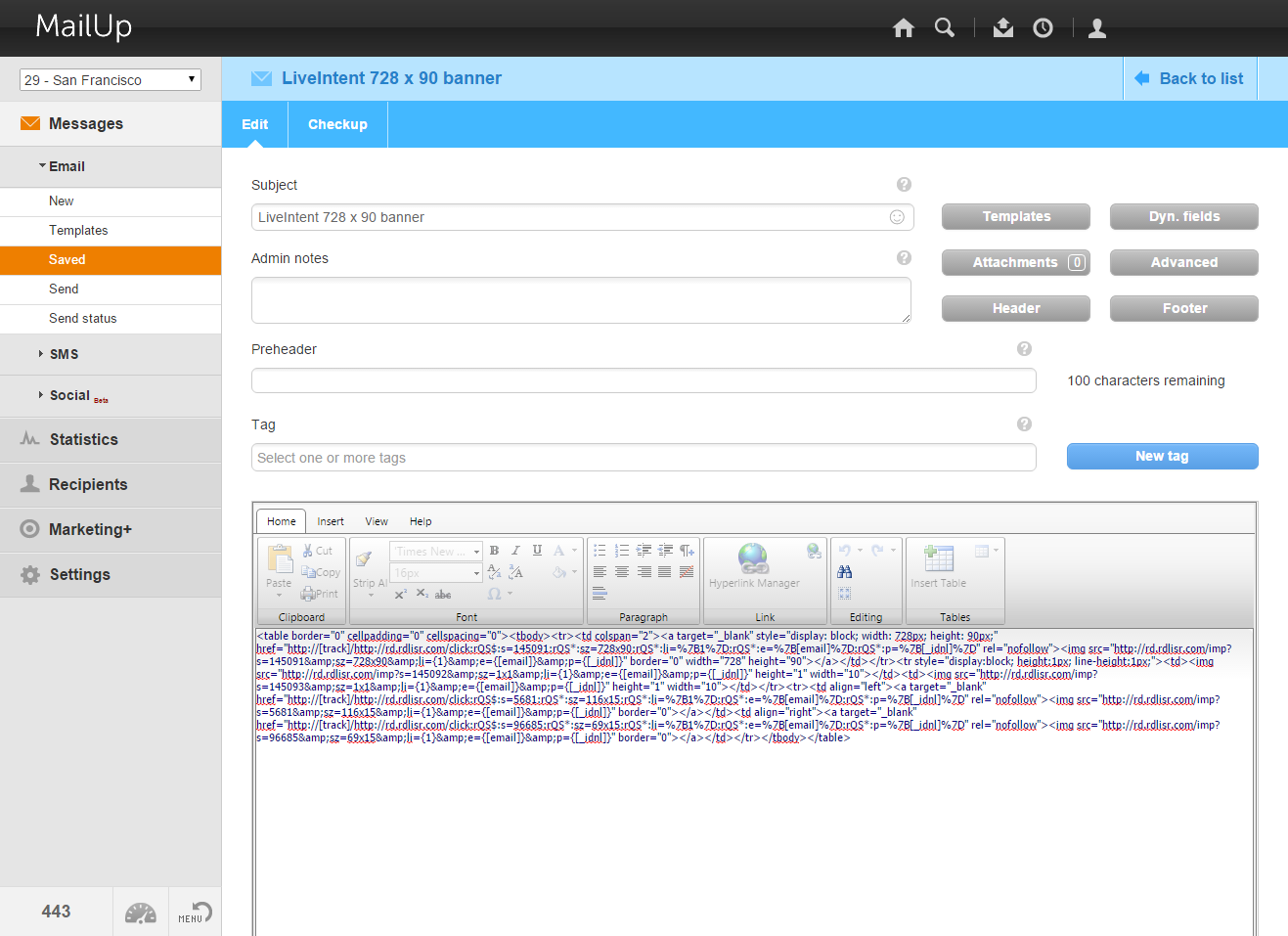 LiveIntent targets well-established brands, and it requires three million ad impressions per month (emails actually opened) in order for its services to be activated. To use LiveIntent, you just need to enter the static HTML tags in the email message template so that the ads will automatically appear. We will see how to actually do this on the MailUp platform later in this post.