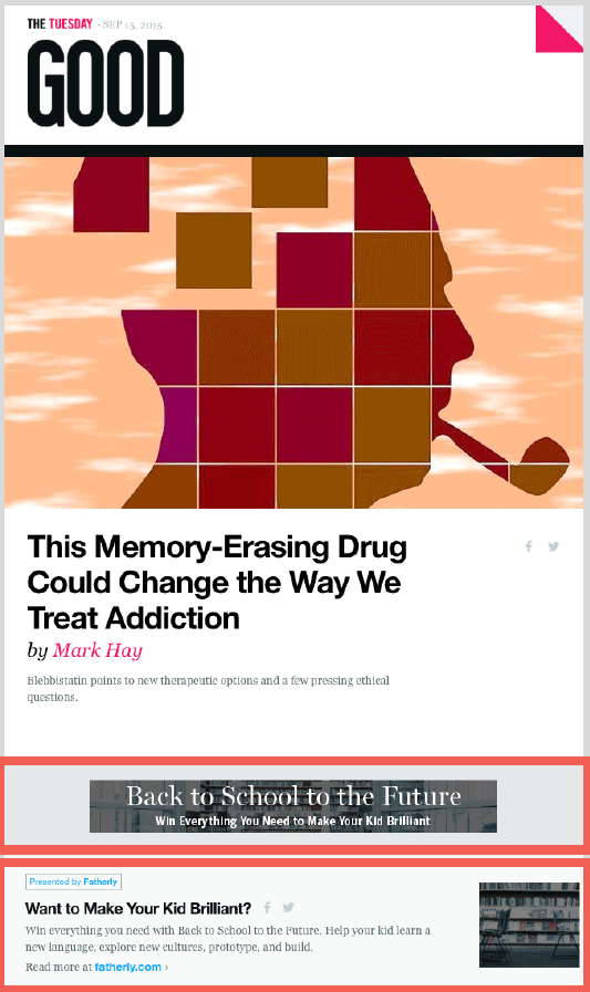 Native advertising is without doubt a growing phenomenon, offering new possibilities for those seeking innovative and potentially more effective approaches compared to the old display banners, which are much less discreet and more invasive than native ads. The example email below contains both a display banner and a native ad (highlighted in red).