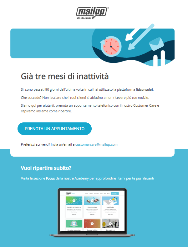 It therefore becomes essential to manage toreactivate these dormant customers.How? With targeted emails that communicate closeness and know how to trigger an action by the customer, withuseful content or the request to get in touch with the company to solve anyproblems that prevent use.
