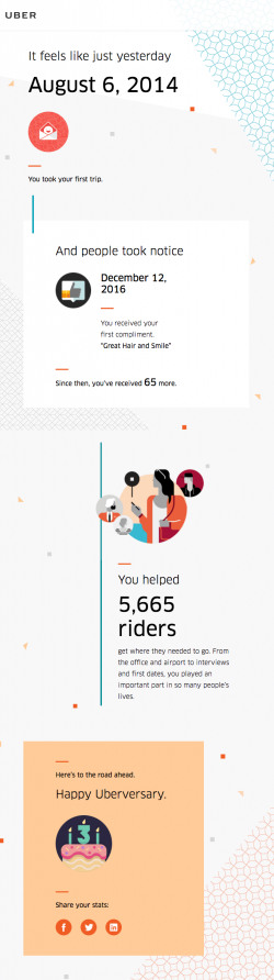 Need an example? Check out this Uber email celebrating the thirdanniversary of customers and the brand.