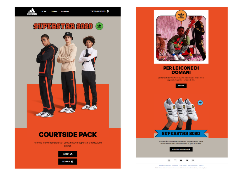 It’s a fairly vertical email (we even had to divide it into two columns) yet with a decidedly limited word count. We counted: there are 37. Both the titles and the descriptions are short. The calls to action are non-verbal, they are just labels (man, woman, and kids). Everything is click-oriented so that the recipient explores the site’s content.