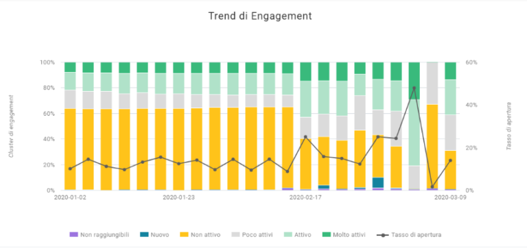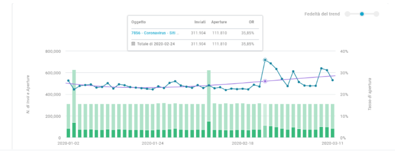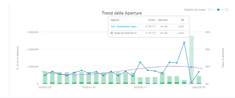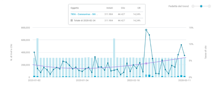 We know how the activities of the recipients on the email are proportional to the relevance of the content conveyed. The chart below shows a customer’s OR and CR rate. Compared to an average of 20% OR and 4% CR, an important message related to the coronavirus emergency pushed the opening rate to almost 40% (double) and the click rate to 15% (+73 %).