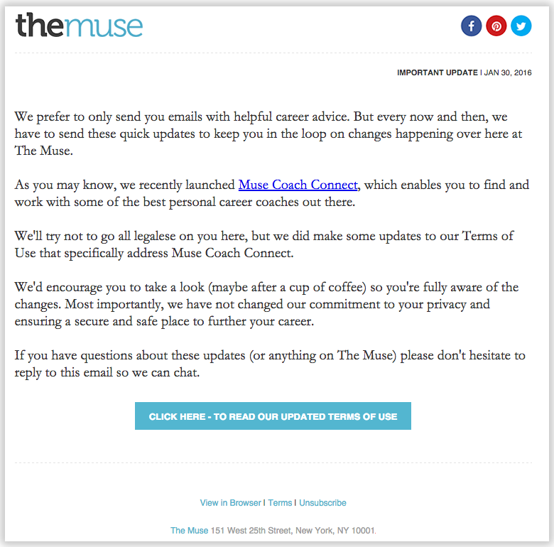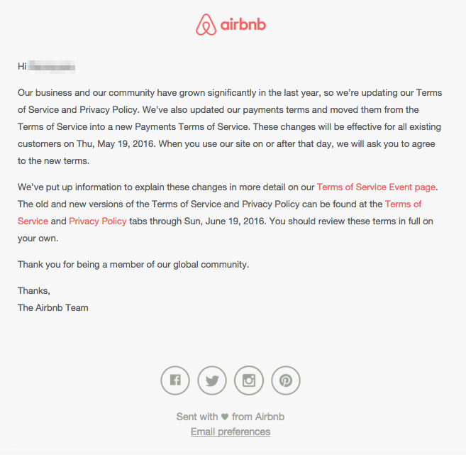 Letter or text-based templates are useful for sending subscribers a personal message or a serious update, like one necessary for legal reasons. You might use a letter to welcome a new subscriber, apologize for an error, or announce a company change. Often, we see text-based emails when companies let readers know about an update to the privacy policy or terms of service, like in this email from AirBNB: