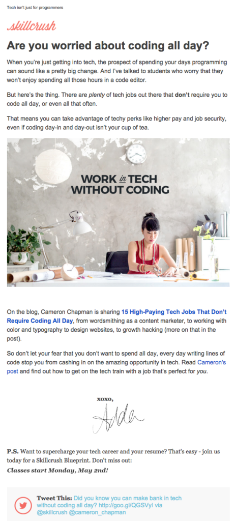 Similarly, some brands use letter-style templates for their standard newsletters, like in this example from Skillcrush: