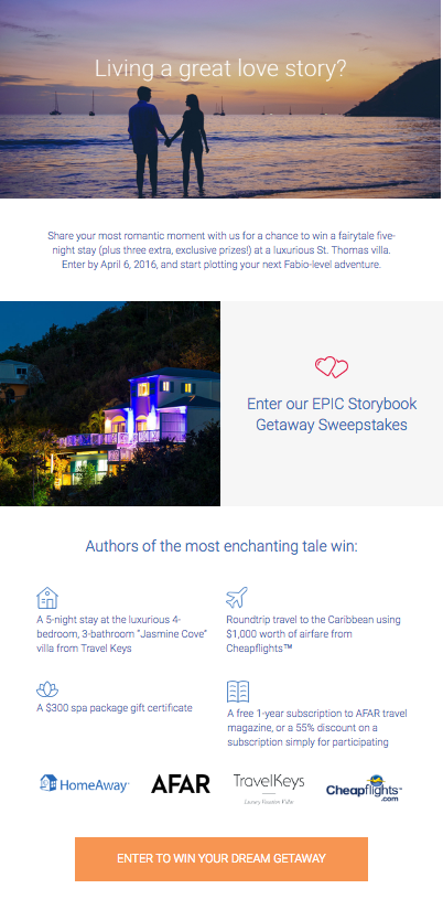 Another email example from HomeAway manages to tug at the heartstrings with an invitation email inviting subscribers to enter a romantic vacation sweepstakes. Not only does the email immediately grab the eye with a strong visual image, but specific keywords reinforce the sweetness (“romantic, fairytale, luxurious, enchanting”). Plus, the strong call-to-actions (one more visual than the other but both using romantic words like “epic” and “dream”) make this email promotion feel more personal.