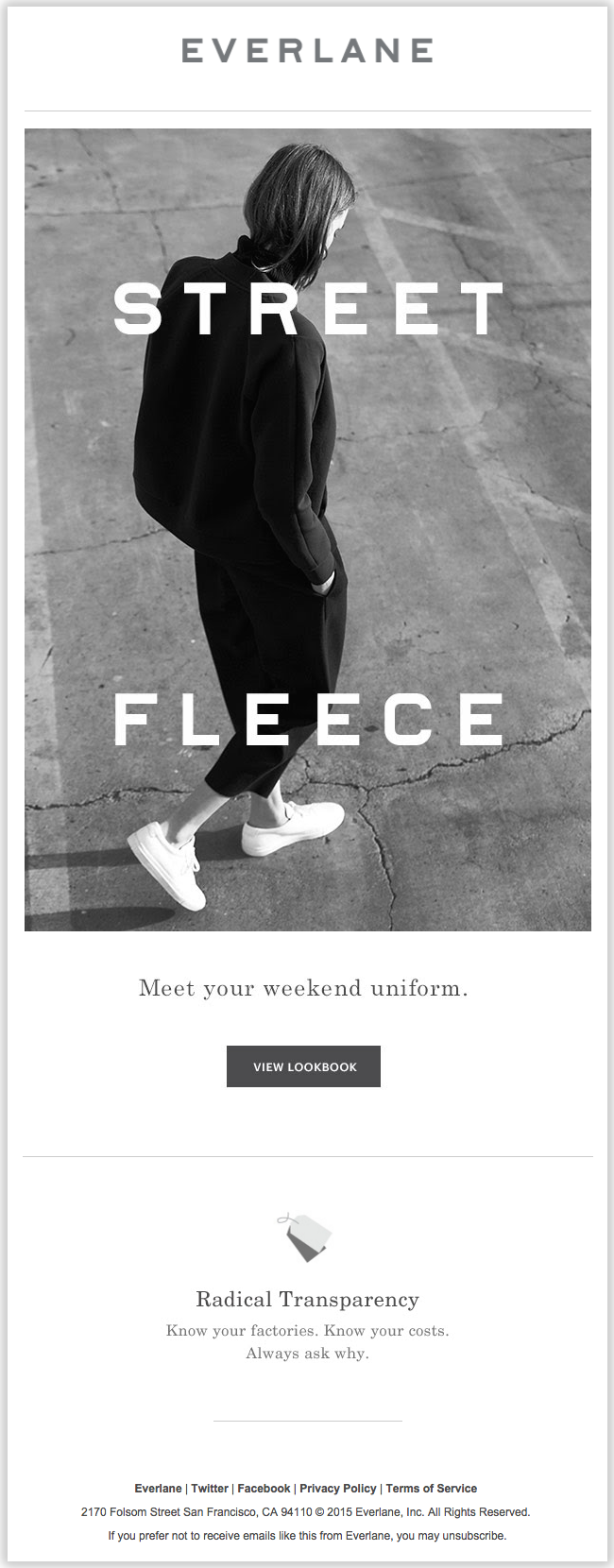 These templates are likely to be updated significantly from one use to another, especially when announcing new products (you’ll probably have special art and color schemes dedicated to the new item), but it’s valuable to have a template with a structure and standard width and flow in place. Everlane, for example, always needs the same header, content dividers, “Radical Transparency” content section, and footer for announcement emails like these.