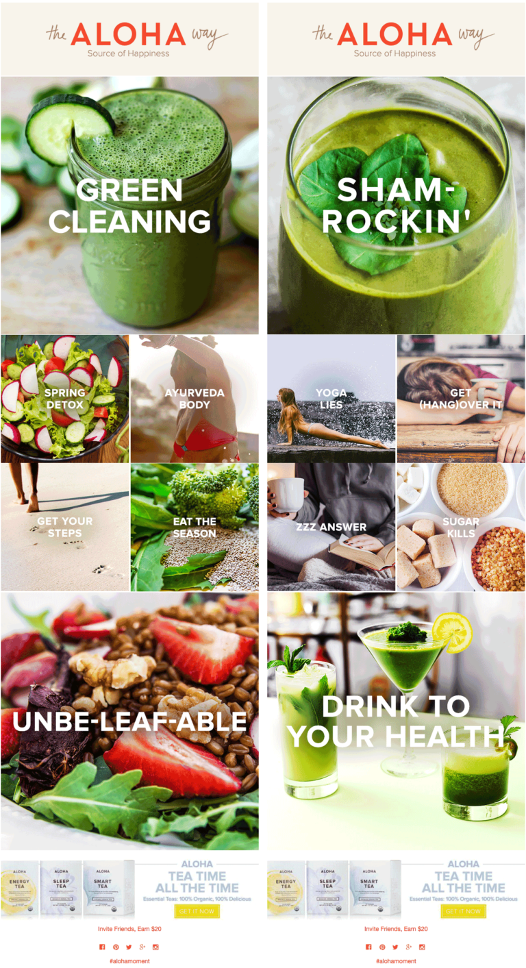 Similarly, Aloha uses a photo collage template to feature recipes and content on its site: