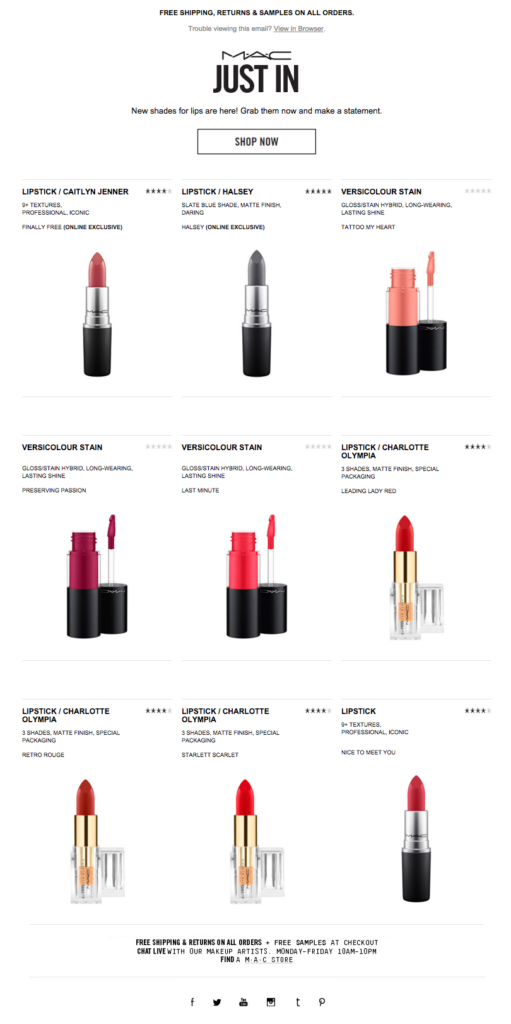 MAC Cosmetics also uses a grid style to send out regular emails featuring its bestselling or newest products: