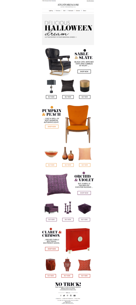 All items are organized by color (which readers have been primed for with this subject line: “These 4 colors ARE Halloween.”). Playing with a color scheme is a smart and simple way to build a holiday email without feeling like you’re straying too much from your brand identity. If it’s not your thing to drape your email in spider webs, ATG shows you how to take a subtler approach.