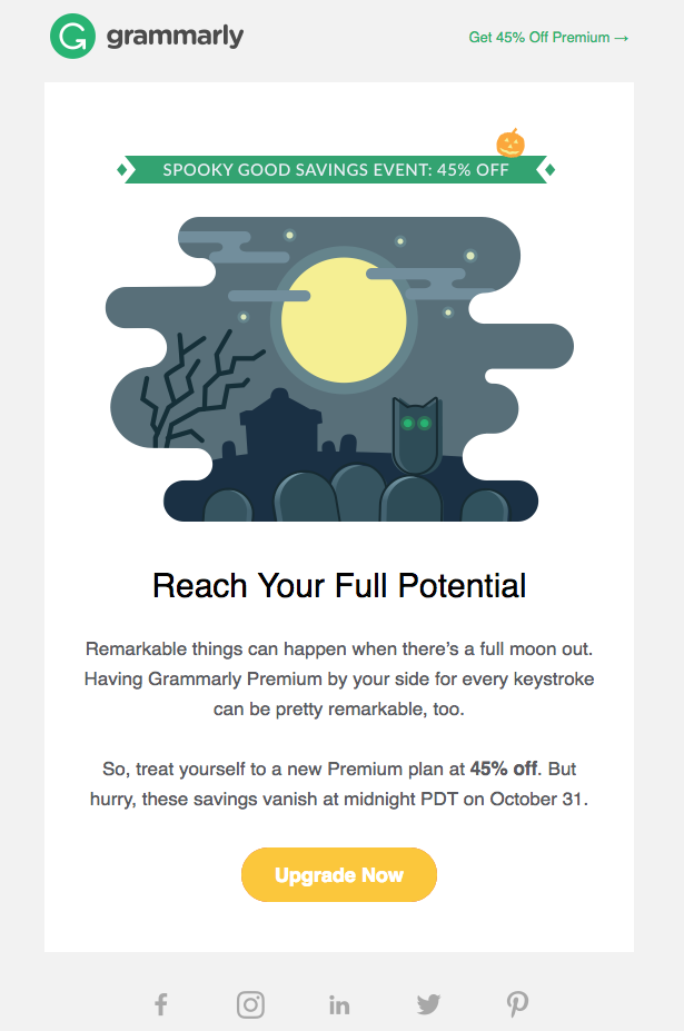 Grammarly, a proofreading tool, also doesn’t have an obvious tie to the holiday. Like ATG, Grammarly isn’t selling Halloween decor, candy, or witch costumes. Yet Grammarly celebrates the holiday with a sale by using thoughtful illustration and playful copy—which is hopefully enough to draw in readers.