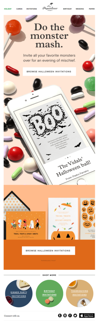The visual elements in your email can make or break how well it performs. This means that instead of including the same standard product images again and again, getting creative will keep your readers’ attention. In its Halloween email, Paperless Post shows us how clever prop staging and out-of-the-box thinking can make a digital product (an e-invitation) a lot more exciting to look at in your inbox.